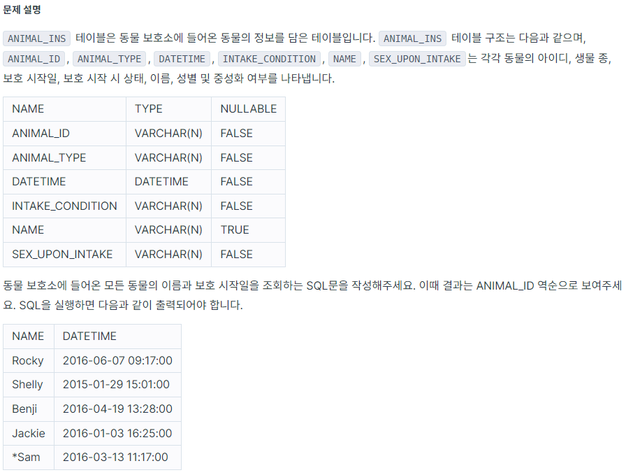 - SELECT절에 동물의 이름을 나타내는 ANIMAL_ID와, 보호 시작일을 나타내는 DATETIME을 쓴다.