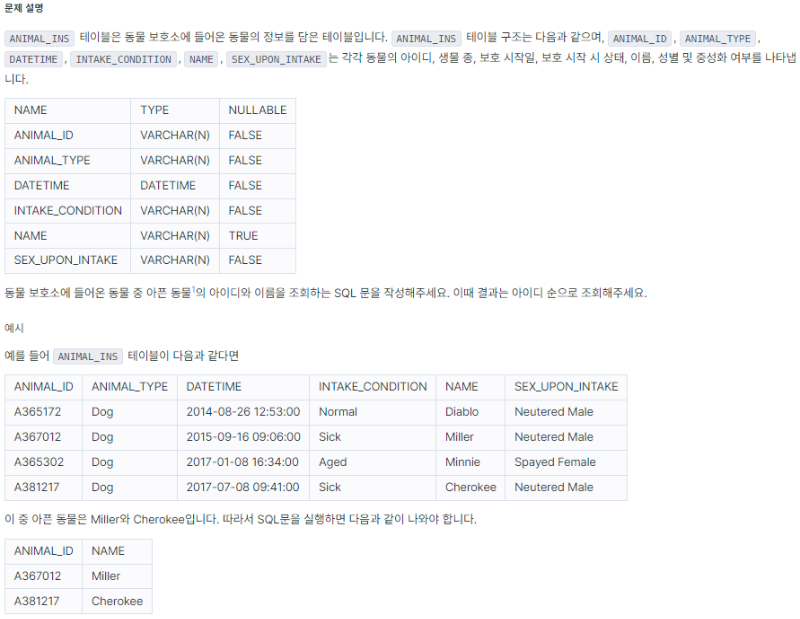 프로그래머스 아픈 동물 찾기 (SELECT/Level 1)
