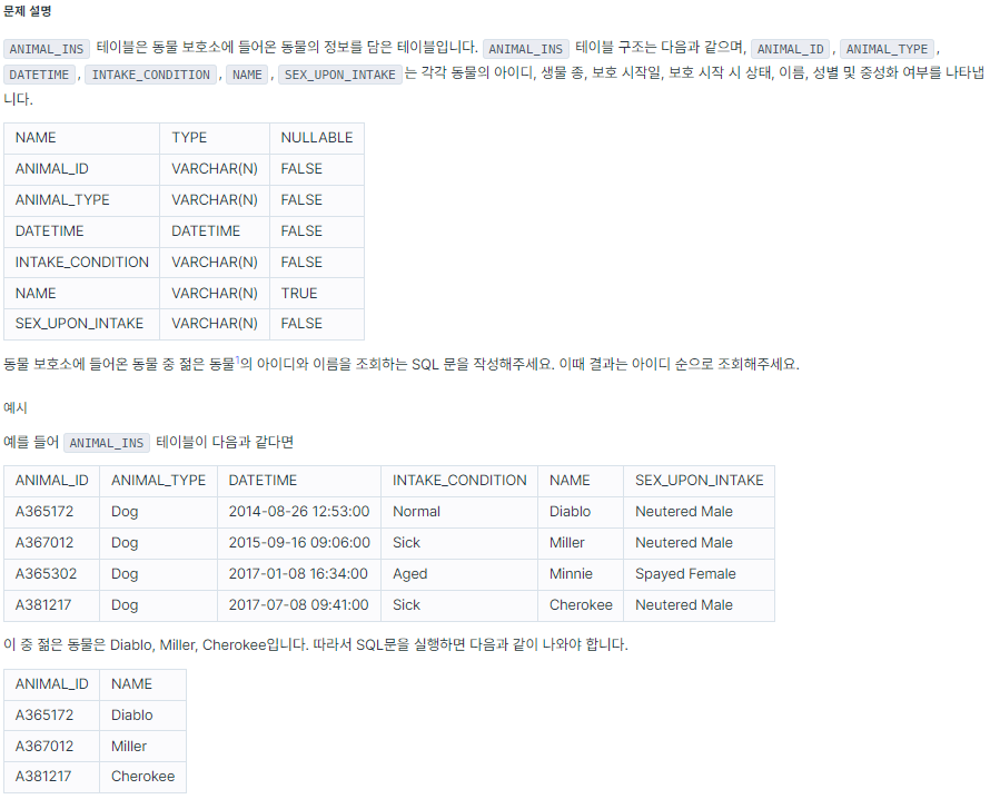 - SELECT절에 동물의 아이디(ANIMAL_ID)와 동물의 이름(NAME)을 적는다.