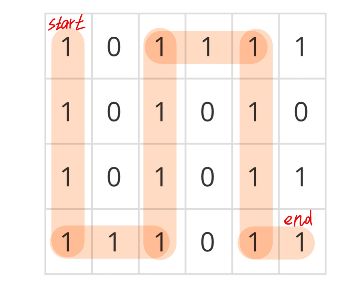 ์ ์ฌ์ง์ ๋ฏธ๋ก๋ฅผ ๋ํ๋ธ ๊ฒ์ด๋ค. 1์ ์ด๋ํ ์ ์๋ ์นธ์ด๊ณ , 0์ ์ด๋ํ ์ ์๋ ์นธ์ด๋ค. Start์นธ์์ End์นธ๊น์ง ๊ฐ์ผํ๋๋ฐ, ์ง๋๊ฐ ์ ์๋ ์ต์์ ์นธ์ ๊ตฌํ๋ฉด ๋๋ค. ์ฃผํฉ์ ํ๊ด์ผ๋ก ์น ํ ๊ณณ์ด ์ง๋๊ฐ ์ ์๋ ์ต์ ์นธ ๊ฐ์๋ฅผ ์ผ ๊ฒ์ด๋ค. ์นธ ๊ฐ์๋ฅผ ์ ๋ ์์์นธ๊ณผ ๋ง์ง๋ง์นธ๋ ํฌํจ๋๋ค. ๊ทธ๋ผ ์ด์ ๋ฌธ์ ๋ฅผ ํ์ด๋ณด์!