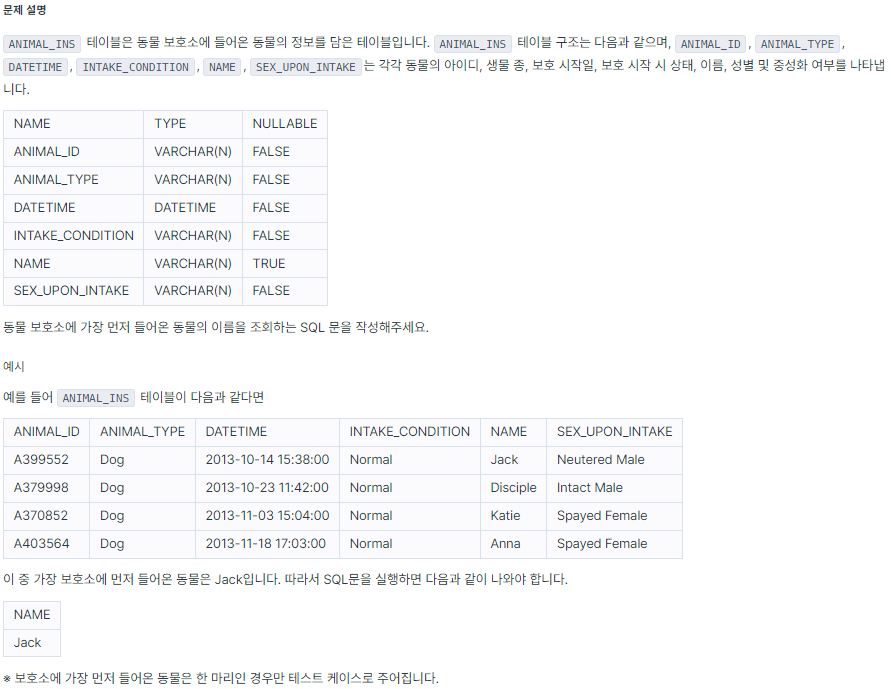 - ๊ฐ์ฅ ๋จผ์ ๋ค์ด์จ ๋๋ฌผ์ ์กฐํํ๋ ์กฐ๊ฑด์ด ์์ผ๋ฏ๋ก, ๋ณดํธ์์์ผ(DATETIME)์ด ๊ฐ์ฅ ์ค๋๋ ๊ฒ์ ์ฐพ์ผ๋ฉด ๋๋ค. ์ด๋, DATETIME์ด ์ต์์ธ ๊ฒ์ ๊ฒ์ํ๋ฉด ๋๋๋ฐ WHERE์ ์์๋ ์ง๊ณํจ์๋ฅผ ์ฌ์ฉํ ์ ์๋ค.