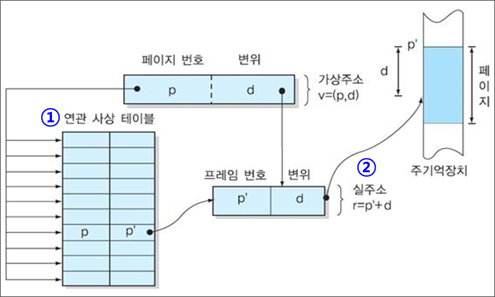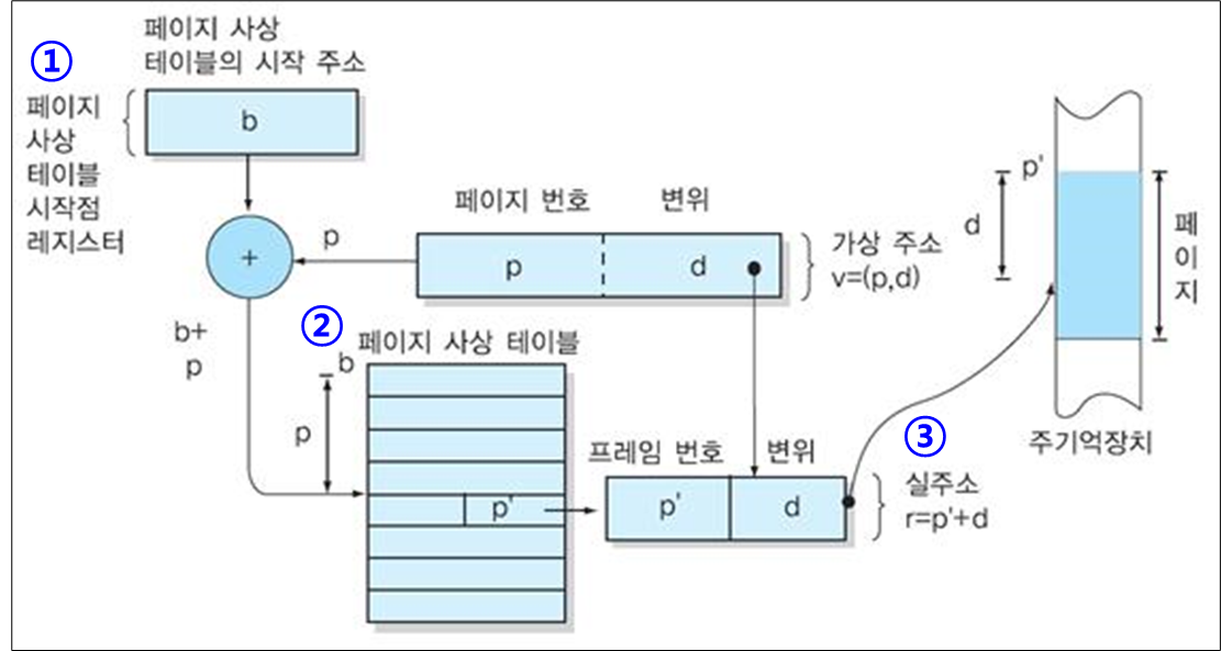 - 주기억장치에 저장되어 있는 페이지 사상 테이블을 이용하여 동적 주소 변환을 수행한다.