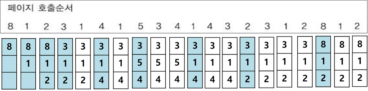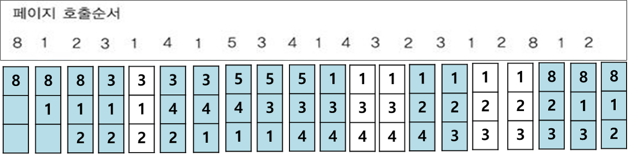 프로세스에 할당된 주기억장치 내의 페이지 프레임 수를 3개로 가정한다.