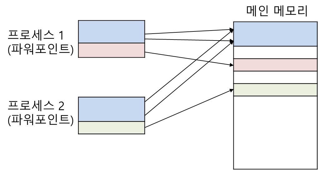 - Ex) 여러 사용자가 동일 프로그램 이용 시에 프로그램 자체를 위한 페이지는 공유하여 사용하지만, 각 사용자가 이용하는 데이터를 위한 페이지는 별도로 사용한다.