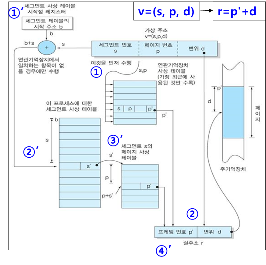 - 페이지 사상 테이블이 주기억장치와 연관기억장치에 나눠져서 관리된다.