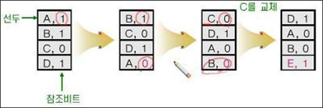 - 각 페이지마다 참조 비트를 두고, FIFO 기법을 이용하여 페이지 교체를 수행한다.