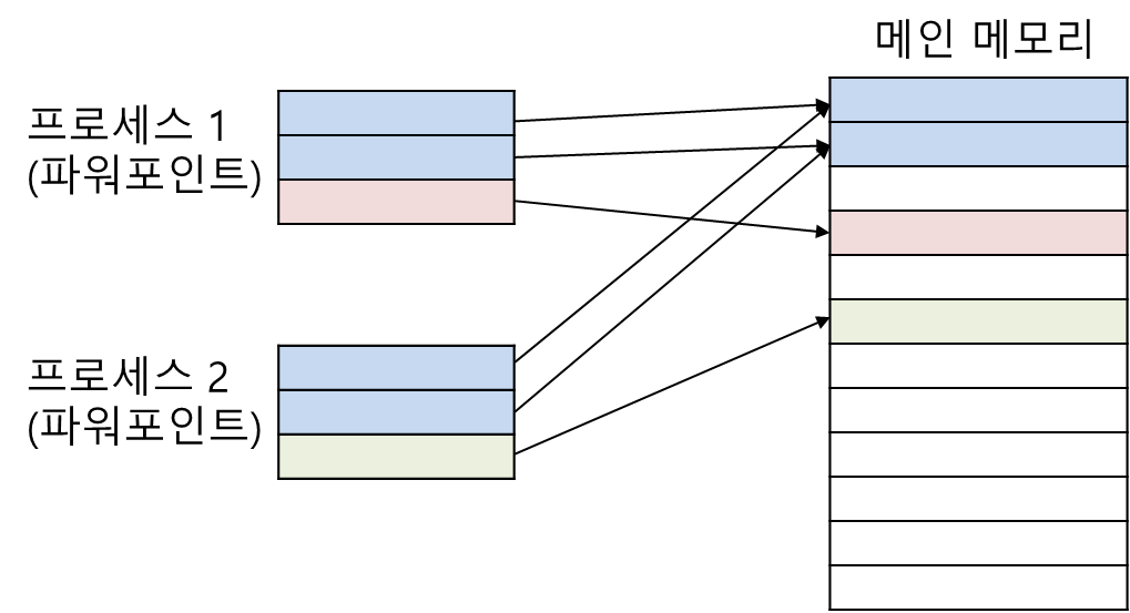 - Ex) 여러 사용자가 동일 프로그램 이용 시에 프로그램 자체를 위한 페이지는 공유하여 사용하지만, 각 사용자가 이용하는 데이터를 위한 페이지는 별도로 사용한다.