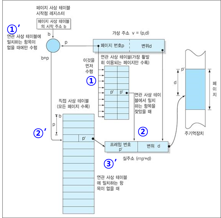 - 페이지 사상 테이블이 주기억장치와 연관기억장치에 나눠져서 관리된다.