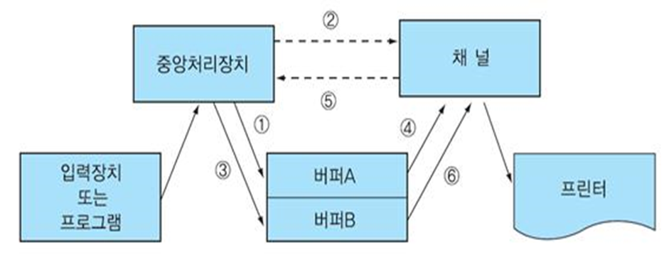 - 입출력 채널은 버퍼 B를 출력하고, CPU는 다시 버퍼 A를 채운다.(병행 처리)