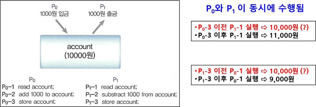 *동기화 : 협력하는 프로세스 간에 실행 순서가 필요하다. ex)입금이 끝나야 출금이 수행되어야 한다.