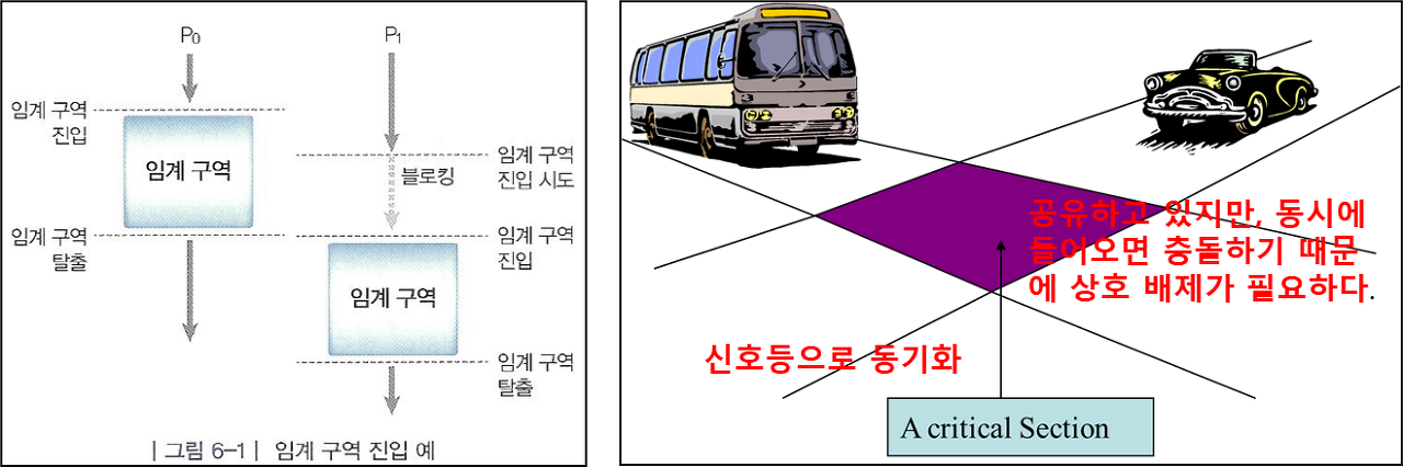 - 어떤 프로세스가 공유 자원을 접근하면, 그 프로세스는 임계구역에 있다고 한다.
