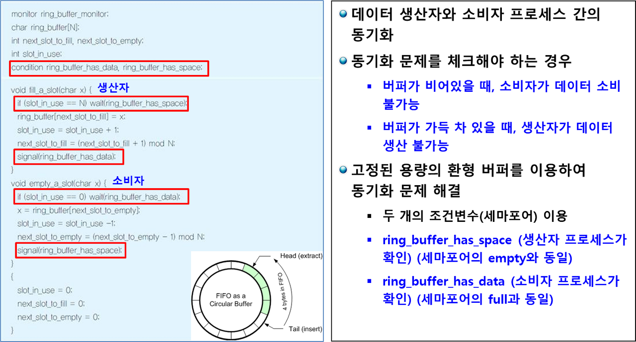 환형 버퍼에서 생산자/소비자 문제에 대한 모니터 사용 예시