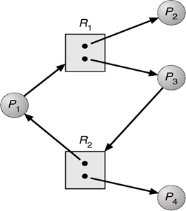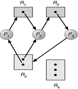 o P1→R1→P3→R2→P1 - ํ๋ก์ธ์ค P4๊ฐ ์์ํํ R2๋ฅผ ํด์ ํ ์ ์์. ์ฆ, R2๊ฐ P4์๊ฒ์ ํด์ ๋ ํ, ์ด ์์์ด P3์ - ํ ๋น๋๋ฉด, ์ํ์ด ์์ด์ง