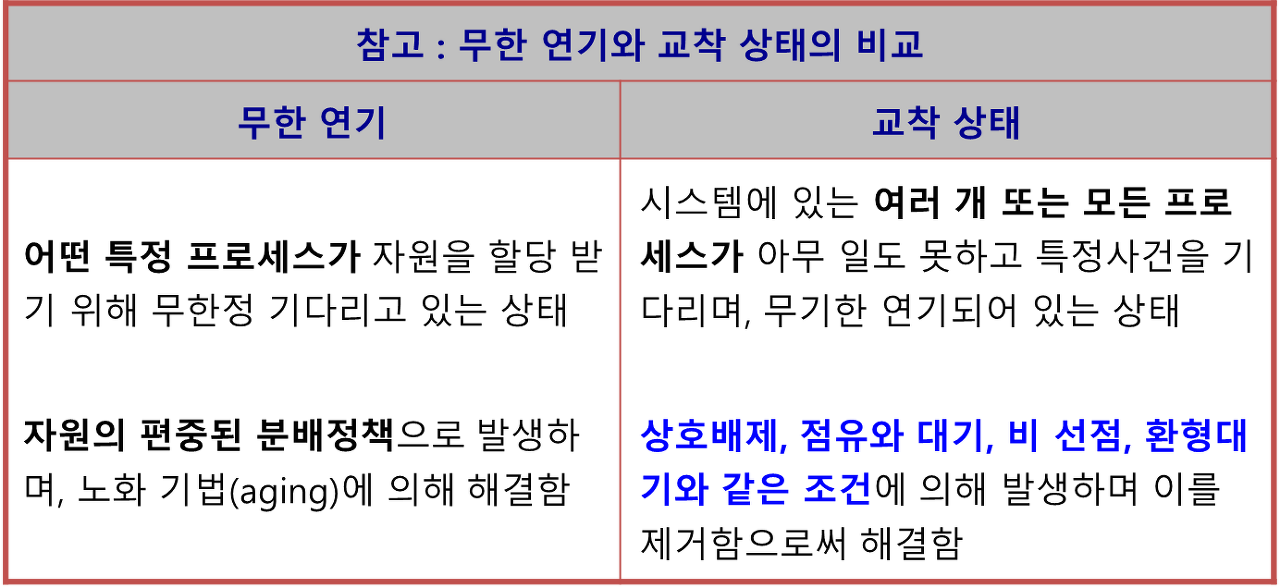 - ์ด๋ค ํ๋ก์ธ์ค๊ฐ ์ํํ๋ ค๊ณ ํน์ ํ ์์์ ์ํ์ฌ ๋ฌดํ์ ๊ธฐ๋ค๋ ค๋ ๋์ ํ ํด๊ฒฐํ ์ ์๋ ์ํ์ด๋ค.