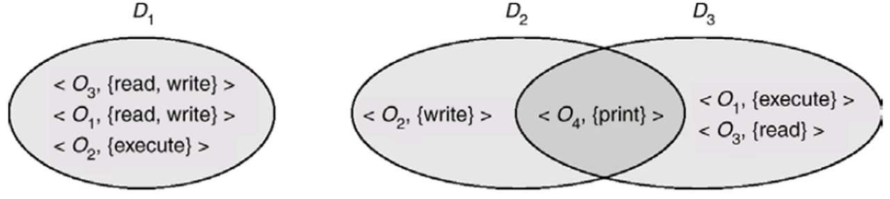 - 예시 : Unix에서 Domain(영역)은 사용자를 의미하고, 영역 내에 있는 프로세스들은 동일한 접근 권한을 가진다. ( Domain별 동일한 접근 권한 )