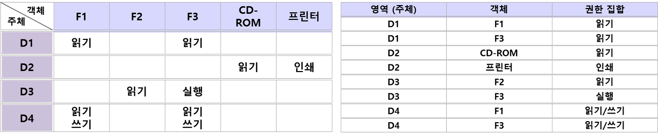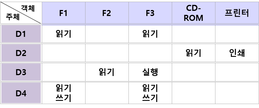 - 각 행렬의 엔트리는 어떤 주체(영역)가 대응하는 객체(자원)에 대하여 실행할 수 있는 접근 허가(권한)를 나타낸다