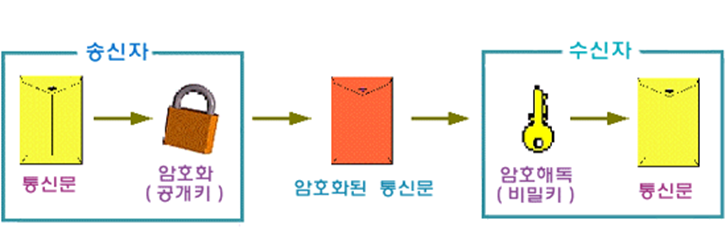 - 서로 다른 두 개의 키를 이용하는 방법으로, 두 개의 키 중에 하나는 공개되어 있는 공개 키(public key)이고, 다른 하나는 개인이 비밀리에 보관하고 있는 개인 키(private key)이다.