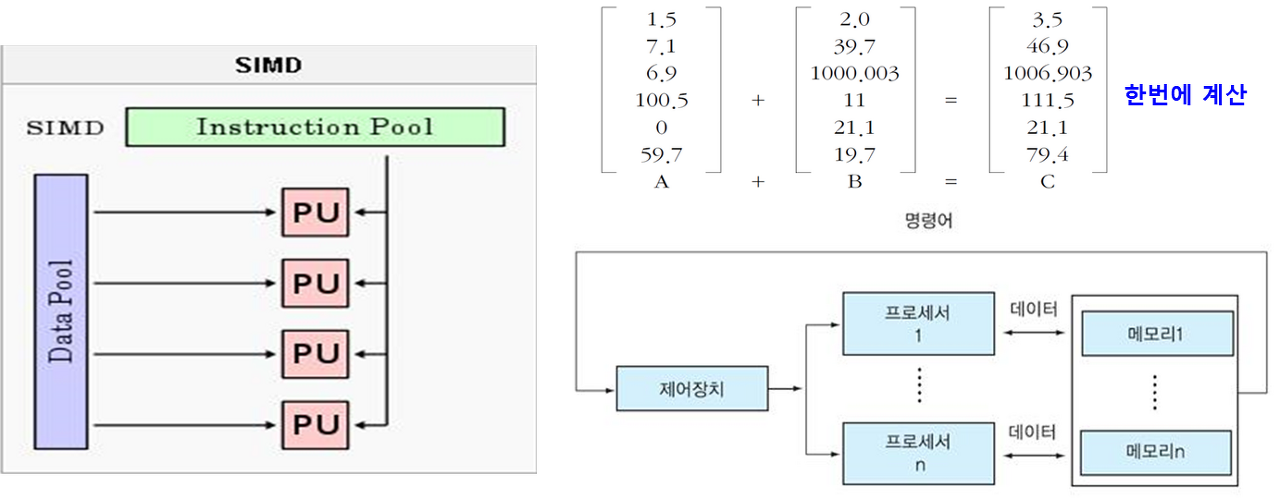 - 모든 프로세서들은 제어장치로부터 동일한 명령어를 받지만 명령어 실행 과정에서 서로 다른 데이터들을 사용한다.