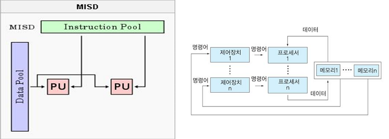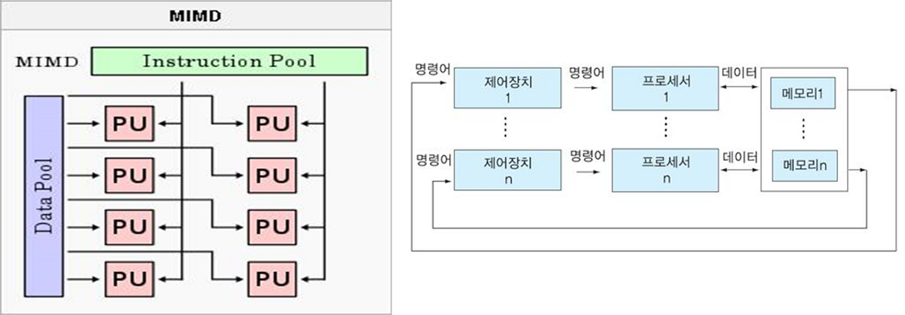 - 여러 개의 프로세서들이 서로 다른 명령어와 데이터를 처리하며, 대부분의 다중 처리 시스템이 여기에 해당된다.