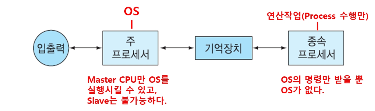 - 하나의 특별한 프로세서인 주 프로세서만이 OS를 실행하고 종속 프로세서는 오직 사용자 프로그램만을 실행한다.