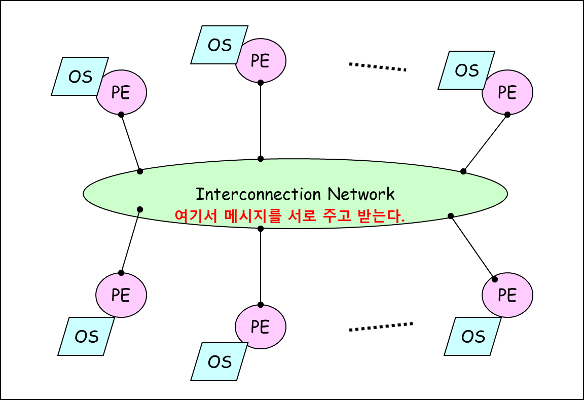| 프로세서들 간 통신을 위한 message passing (메시지 전달) 기법 사용 | 프로세서들 간의 메모리 접근 경쟁 (memory connection) 해결 필요 |