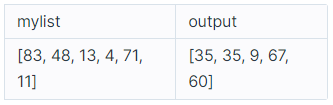 숫자를 담은 리스트 mylist가 solution 함수의 파라미터로 주어집니다. solution 함수가 mylist의 i번째 원소와 i+1번째 원소의 차를 담은 일차원 리스트에 차례로 담아 리턴하도록 코드를 작성해주세요. 단, 마지막에 있는 원소는 (마지막+1)번째의 원소와의 차를 구할 수 없으니, 이 값은 구하지 않습니다.