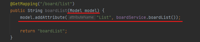 해석하면, "List"라는 이름으로 보낼건데 boardService의 boardList를 담아서 보낼거라는 말이다. boardService의 boardList를 실행하면 반환된 리스트를 "List"라는 이름으로 받아서 넘긴다.