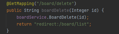 - ์ฝ๊ฒ ๋งํด, ๊ธ์ด ์ญ์ ๋๋ฉด ๋ฆฌ์คํธ ํ๋ฉด์ผ๋ก ๋์ด๊ฐ๋ ๊ฒ ์ผ๋ฐ์ ์ด๋ฏ๋ก ๋ฆฌ์คํธ๋ก ์ด๋(์ ํ)์ํจ๋ค. ๋ฐ๋ผ์ redirect: ๋ค์ ์ด๋์ํฌ ๊ฒฝ๋ก๋ฅผ ์ง์ ํด์ค๋ค.