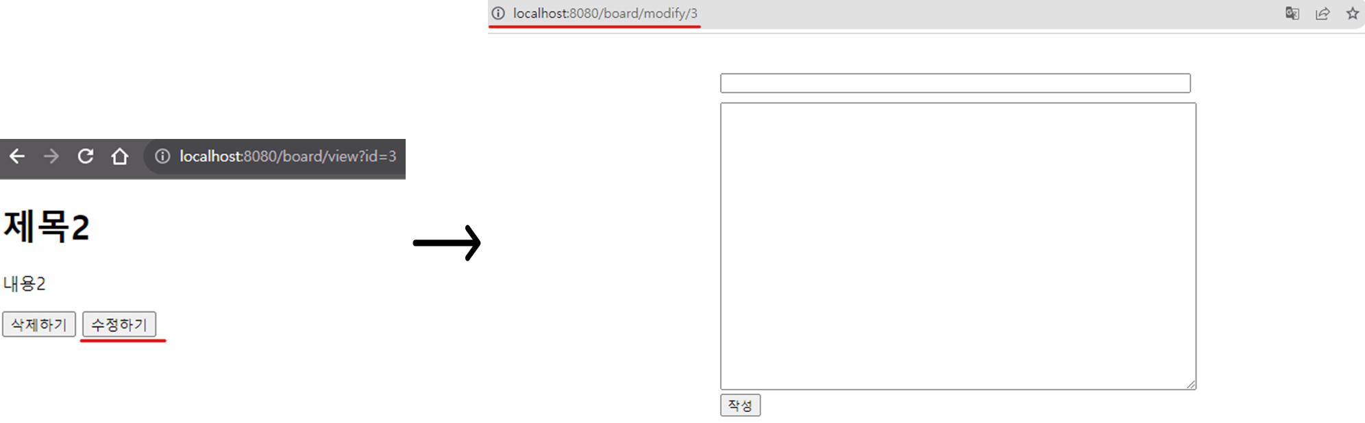 실행 결과, '수정하기' 버튼을 클릭했더니 상세 페이지(/board/view?id=3)의 제목과 내용이 수정 페이지(/board/modify/3)에서도 동일하게 나오는 것을 볼 수 있다.