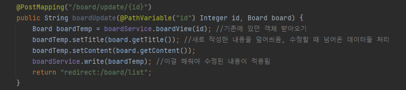 또한, 상세 페이지의 url은 ?id=3으로 되어 있지만, 수정 페이지의 url을 보면 3으로 되어 있다. 이는 @PathVariable를 사용해서 url이 깔끔하게 처리된 것이다.