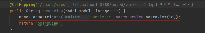 - model.addAttribute(String name, Object value) : value 객체를 name 이름으로 추가함. 뷰 코드에서는 name으로 지정한 이름을 통해서 value를 사용함.