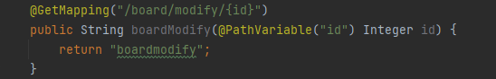 - @GetMapping path의 {변수} 괄호 안에 괄호 그레이스를 열어 URL에 사용될 변수 명을 입력한다.