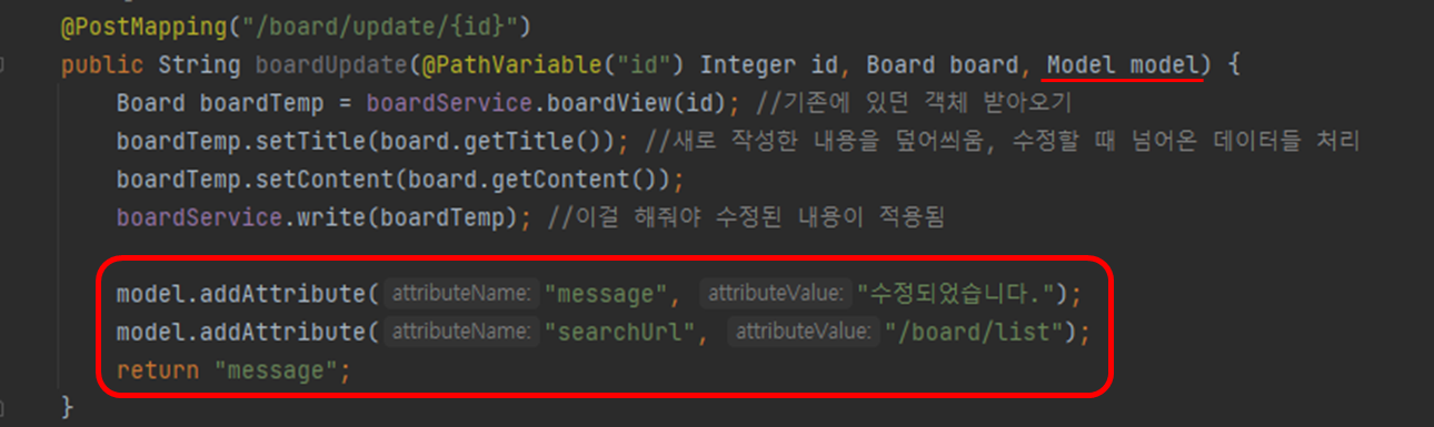 boardWriteDo 메소드와 동일하게 Model 객체를 추가한다.
