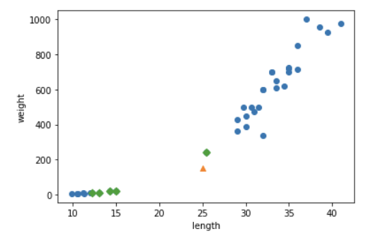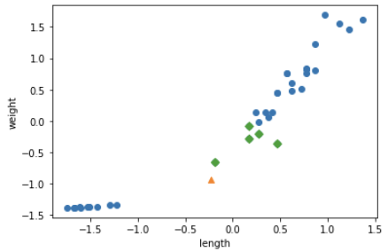 초록색 마름모는 삼각형 샘플에 가장 가까운 5개의 샘플이다. 직관적으로 봤을 때 1개는 도미의 데이터와 더 가깝다. 그러나 나머지 샘플 4개는 모두 빙어로 표시된다. 확실하게 알기 위해 거리를 확인해보자.