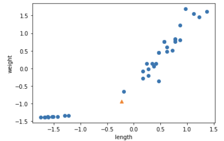 그 결과, 도미 샘플과 가장 가까운 5개 샘플이 모두 도미이다. 이처럼 스케일이 다른 특성을 잘 처리해야 올바른 값을 도출할 수 있다.