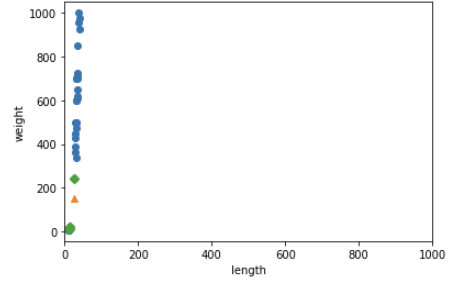 결과를 보면 첫 번째 샘플까지의 거리가 92이고, 나머지 4개는 그것보다 더 거리가 멀어야 직관적으로 봤을 때 정상이다. 그러나 그렇지 않다. 거리 비율이 이상한 걸 볼 수 있다. 이유는 무게와 길이 비율이 처음부터 일치하지 않기 때문이다. x축은 범위가 좁고, 그에 비해 y축은 범위가 아주 넓다.