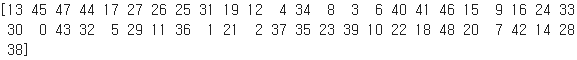 랜덤하게 섞은 인덱스에서 35개의 샘플을 선택해 훈련 세트로 만들었다.