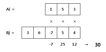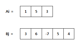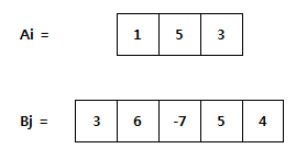 N 개의 숫자로 구성된 숫자열 Ai (i=1~N) 와 M 개의 숫자로 구성된 숫자열 Bj (j=1~M) 가 있다. 아래는 N =3 인 Ai 와 M = 5 인 Bj 의 예이다.