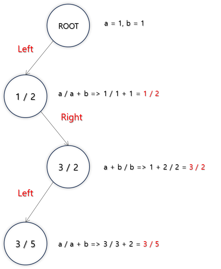 Calkin-Wilf Tree๋ ๋ชจ๋ ์์ ์ ๋ฆฌ์๋ฅผ ์ค๋ณต ์์ด ํฌํจํ๋ ์ด์ง ํธ๋ฆฌ์ด๋ค. ํธ๋ฆฌ์ ๊ฐ ๋ ธ๋๋ ๋ถ๋ชจ ๋ ธ๋์ ๋ถ์ ab\frac{a}{b}๋ฅผ ๊ธฐ์ค์ผ๋ก ์ผ์ชฝ ์์์ aa+b\frac{a}{a+b}, ์ค๋ฅธ์ชฝ ์์์ a+bb\frac{a+b}{b} ํํ๋ก ์์ฑ๋๋ค. ์ด๋ฅผ ํตํด ์ ๋ฆฌ์๋ฅผ ์์๋๋ก ํ์ํ ์ ์๋ค.