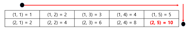 (1, 1) 에서 (2, 5) 까지 가려면, i는 2가 되어야 하고, j는 5가 되어야 한다.