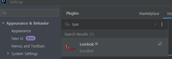 settings > plugins > lombok 검색 후 lombok이 설치돼 있는지 확인하고, 설치가 안 되어 있으면 설치해준다.