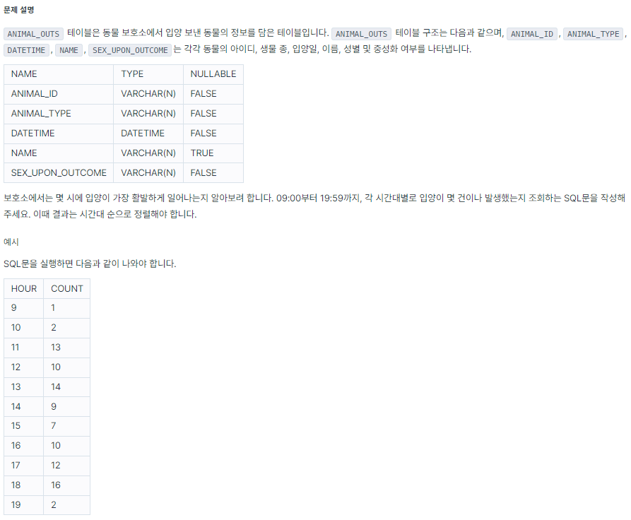 - 시간과 건수를 조회해야 하므로 SELECT절에 DATETIME과 집계함수를 이용한다. 날짜 데이터에서 시만 추출할 때 HOUR를 쓰고, 개수를 세는 COUNT 집계함수를 사용한다.
