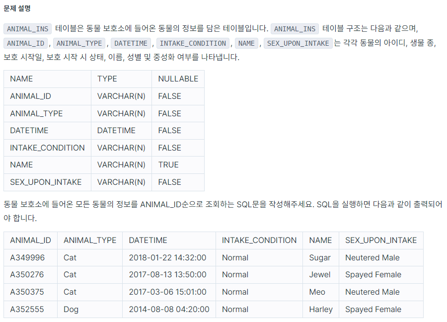 - ANIMAL_ID순으로 조회해야 하므로 ORDER BY를 이용한다. 이때 칼럼명 뒤에 오름차순을 나타내는 ASC를 써야 하는데, 디폴트 값이므로 생략해도 된다.