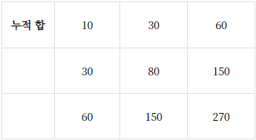 | 누적 합 | 10 | 30 | 60 | 100 | 150 |