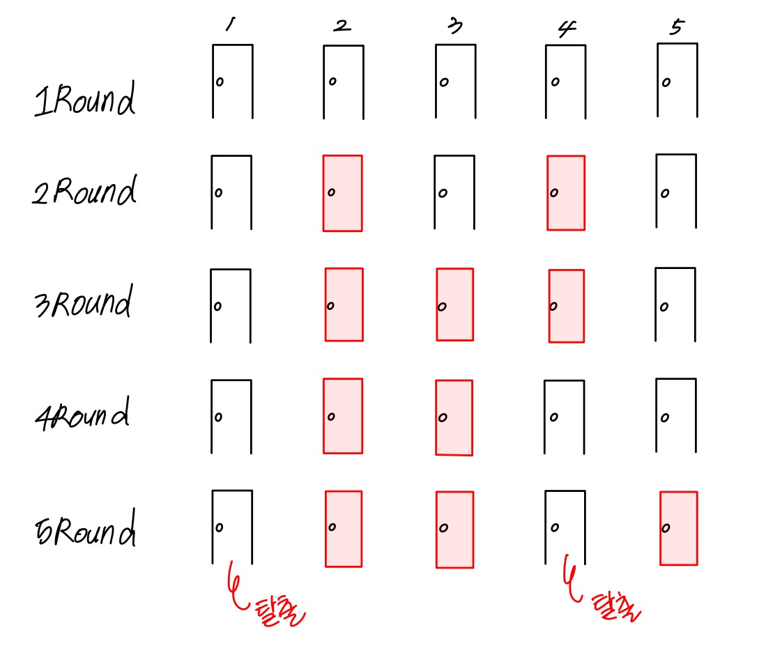 빨간문이 열린 문이다. 1라운드이면 1의 배수의 문만 본다. 2라운드 때는 2의 배수의 문만 본다. 2의 배수의 문들이 닫혀있으면 열고, 열려 있으면 닫는다. 나머지 라운드도 이와 같다.