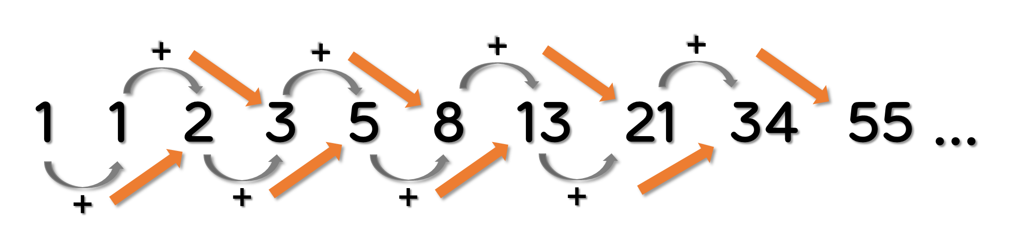 위를 수식으로 표현하면, n 번째 피보나치 수 = (n - 1)번째 피보나치 수 + (n - 2)번째 피보나치 수