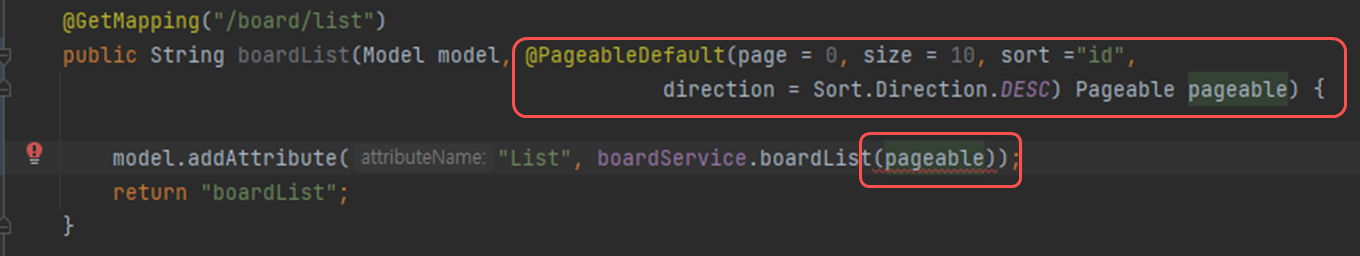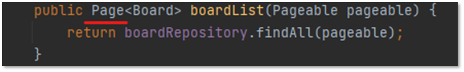인수로 받은 pageable을 boardList에 넘겨줄건데 현재 오류가 난다. 이는 서비스에서 처리를 해주지 않아서 생긴 문제이다. 오류를 해결하기 위해 Service에서 List 메소드를 수정한다.