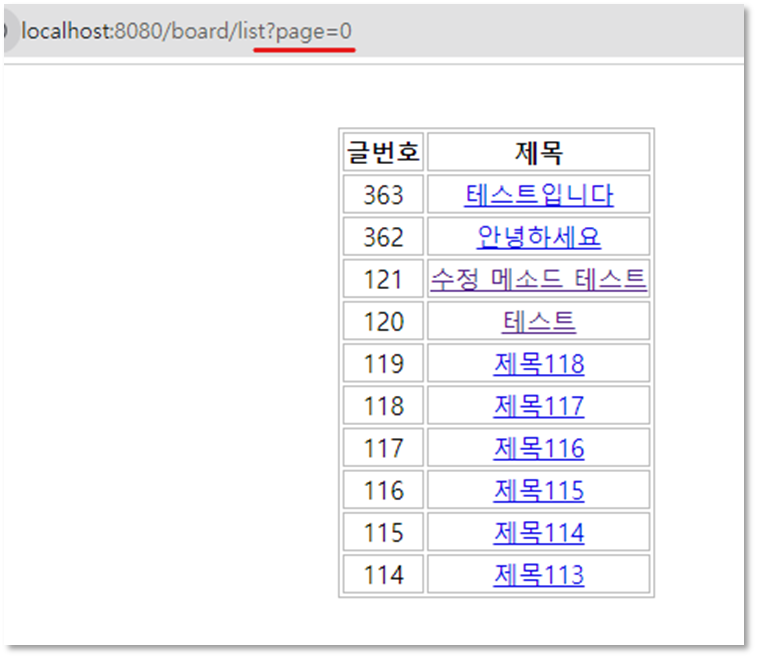 기존에는 모든 게시글이 한 페이지에 다 보였지만, PageableDefault를 통해 페이징 처리한 결과 최신 글이 맨 위로 올라온 걸 볼 수 있고, 한 페이지에 10개의 게시글만 보이는 걸 알 수 있습니다.
