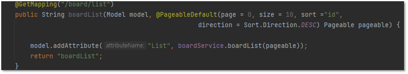 2. 객체를 만들었으니 list를 담아준다. 기존에는 list 자리에 'boardService.boardList(pageable));'가 있었다.