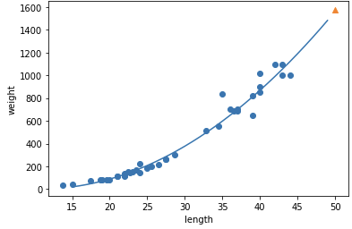 길이가 50cm인 농어에 대한 예측이 직선의 연장선에 있으므로, 모델 훈련이 성공적으로 됐다.